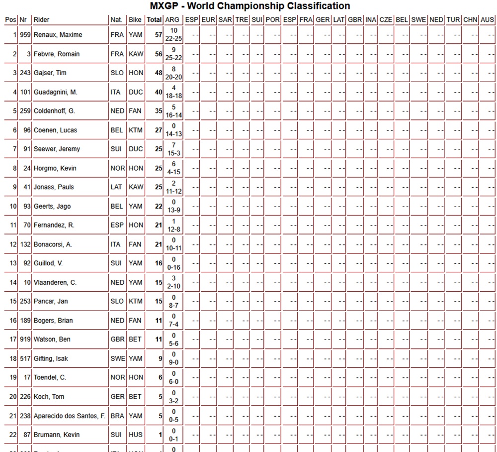 No final da segunda corrida, Renaux e Febvre estavam empatados no topo. O factor decisivo para a vitória de Renaux foi o seu melhor resultado na segunda corrida. Como Renaux também venceu a corrida de qualificação, o piloto de fábrica da Yamaha lidera a tabela do campeonato por um ponto após o primeiro Grande Prémio da época. Tim Gajser (Honda) está 9 pontos atrás, em terceiro lugar.