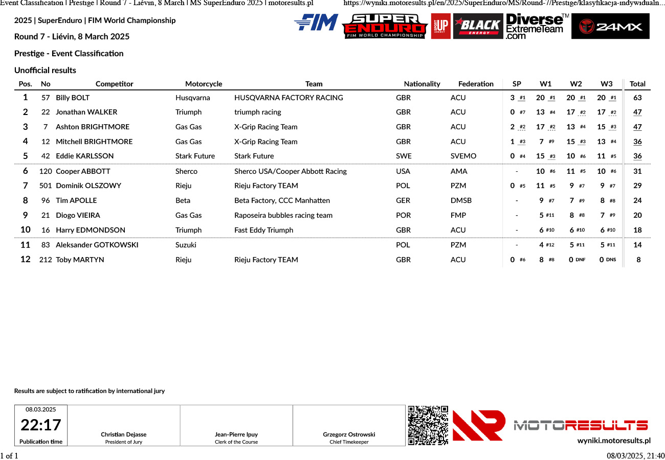 Lievin, a apenas uma hora da costa norte de França, recebeu o SuperEnduro para o final da temporada e uma noite para determinar as posições do campeonato. Com Billy Bolt já coroado como vencedor da classe Prestige na penúltima ronda do passado fim de semana, Lievin concluiu os lugares no pódio e teve a honra final de ver decididas as coroas do Campeão Mundial Júnior de 2025 e da Taça do Mundo Juvenil inaugural.