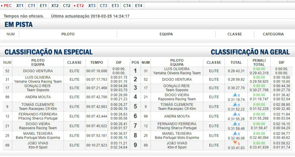 O terceiro lugar é ocupado por Gonçalo Reis (Sherco) que está já a 44,38s, enquanto Diogo Vieira (Yamaha) ascendeu ao quarto lugar a 1m36,42s.