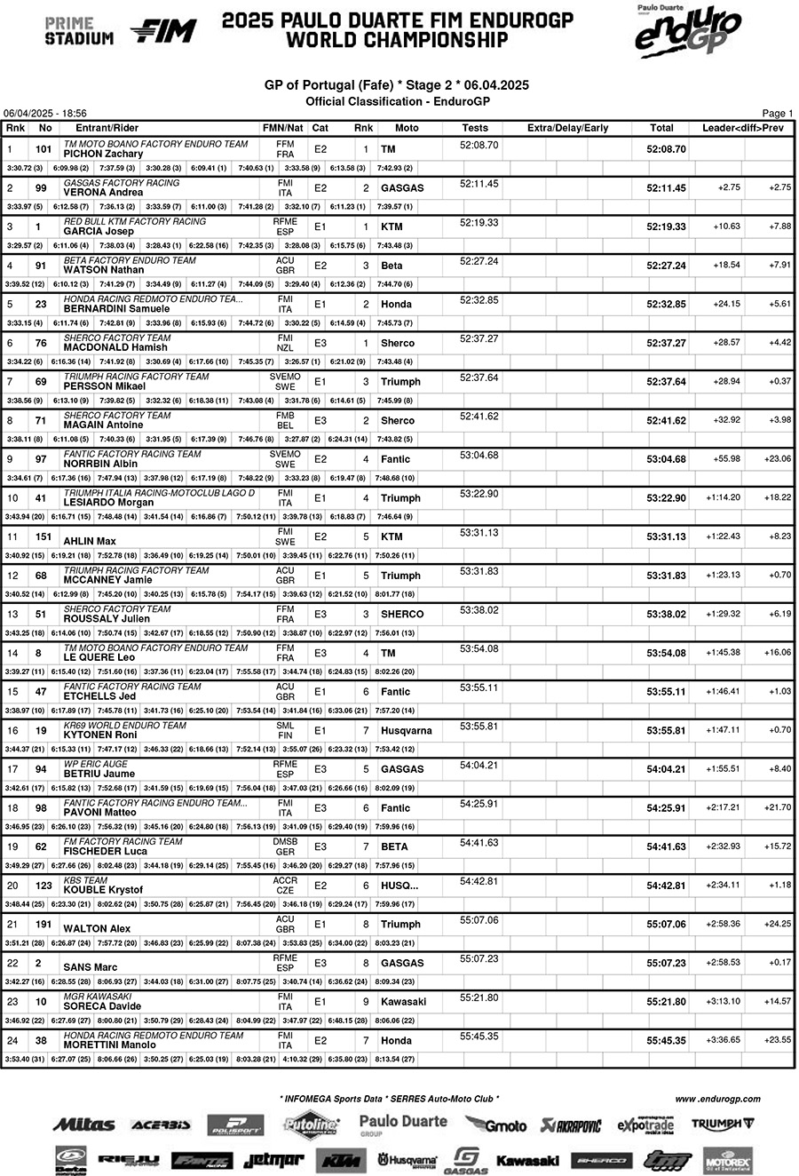 Zach Pichon garantiu a sua primeira vitória geral no EnduroGP em Fafe, apenas um dia depois de conquistar o seu primeiro pódio sénior, superando Verona por dois segundos num final emocionante. Conquistando o seu segundo pódio geral do fim de semana, Josep Garcia seguiu a dupla até ao terceiro lugar. Após uma emocionante ronda de abertura, Pichon lidera a classificação do EnduroGP com apenas dois pontos de vantagem sobre Garcia, com Andrea Verona em terceiro.