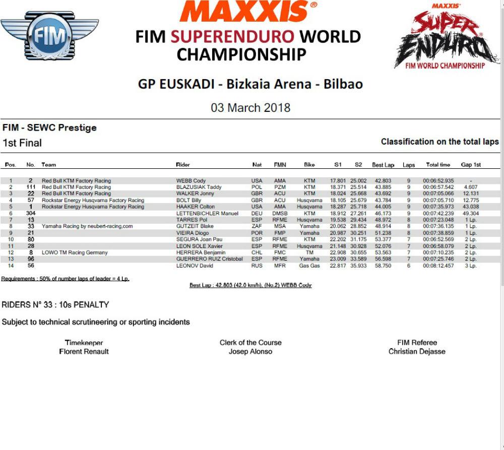 A primeira final do GP de Euskadi, penúltima prova do Mundial de SuperEnduro, que está a decorrer em Bilbau, terminou com a vitória do líder do Mundial, Cody Webb (KTM).