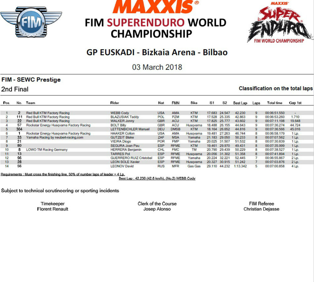 Cody Webb acabou de vencer a segunda final da noite, numa corrida onde o seu principal adversário voltou a ser o seu companheiro de equipa Taddy Blazusiak que depois de ter assumindo o comando da corrida nas primeiras quatro voltas, acabou por ser ultrapassado por Webb que venceu a segunda das três finais da noite e relegou Blazusiak para a segunda posição a 1,710s.