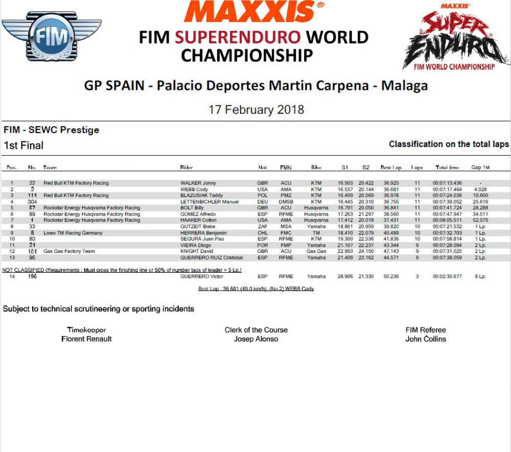 Já o português Diogo Vieira (Yamaha), terminou esta primeira final nas 11ª posição a duas voltas do vencedor e na frente do regressado David Knight (Gas Gas).