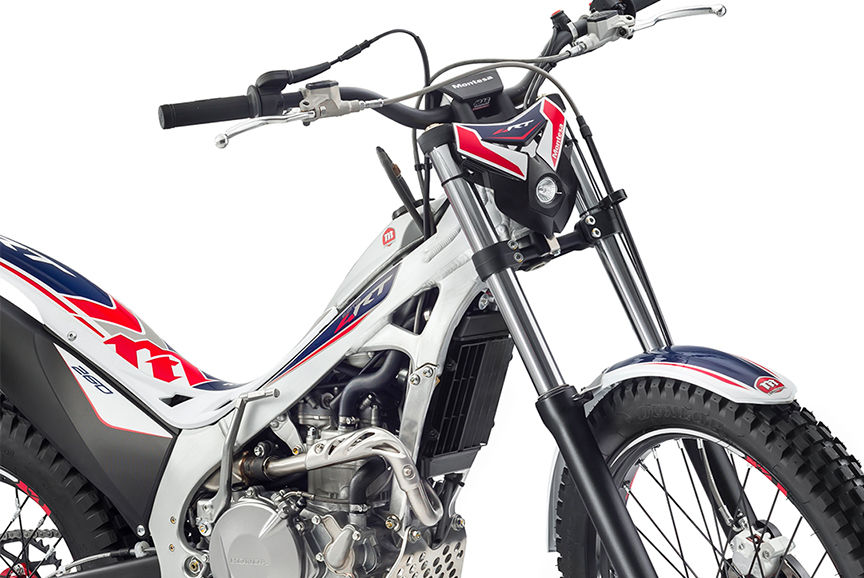 Suspensão dianteira = Forquilha telescópica TECH de 39 mm, com afinação da pré-carga e da extensão