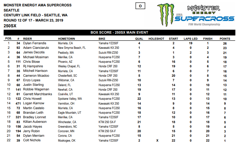 Após a sétima ronda do ano, Adam Cianciarulo manteve o comando do campeonato, tendo mais 12 pontos do que Dylan Ferrandis, piloto que pela primeira vez em três anos venceu no AMA Supercross, o mais importante campeonato do mundo da especialidade.