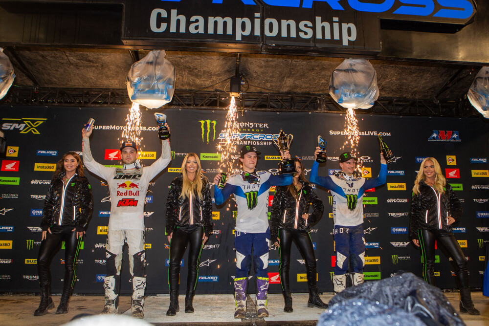 O piloto de fábrica da Triumph, Jordon Smith , atacou Beaumer em segundo lugar na última volta, mas voou por cima do guiador e caiu para o quarto lugar. O piloto japonês da HRC Jo Shimoda , que teve que competir em Anaheim com dois dedos partidos, conseguiu chegar ao 6º lugar e está em 4º lugar na tabela.