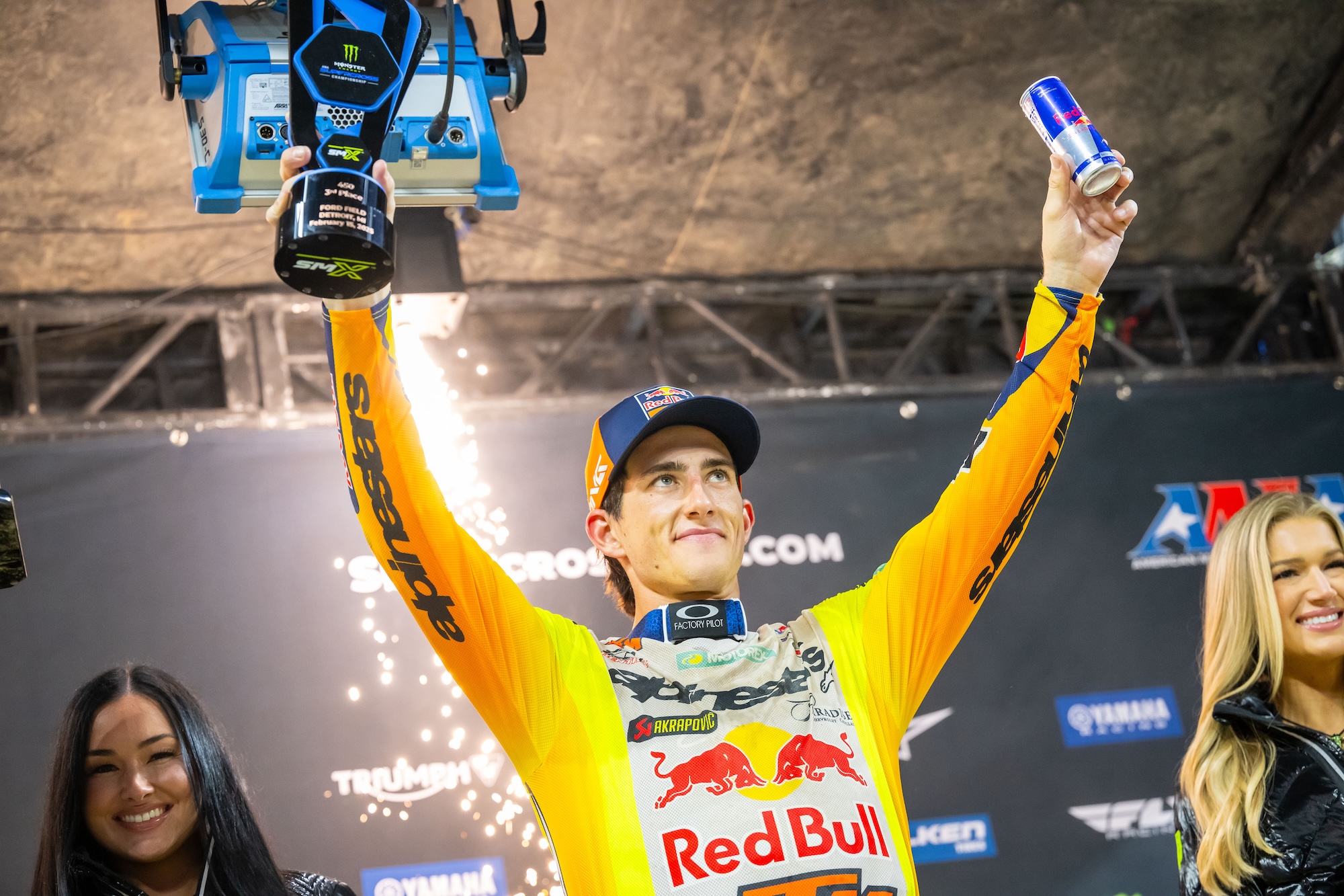 Chase Sexton ficou preso no arranque e caiu na primeira volta, mas a partir daí fez voltas incríveis e fez várias ultrapassagens até chegar ao terceiro lugar. Sexton mantém a placa vermelha, mas agora está empatado em pontos com Cooper Webb tanto no Monster Energy AMA Supercross Championship como no SMX World Championship.