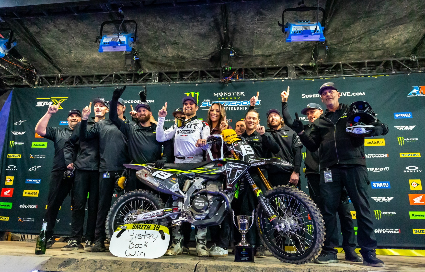 Foi uma corrida incrível em Glendale e que destacou o salto em frente que a Triumph Factory Racing deu na sua segunda temporada do AMA Supercross. Agora vencedor do supercross com as cores da Triumph, Smith subiu para o segundo lugar na classificação do campeonato 250SX Oeste. Apenas dois pontos o separam da placa vermelha.