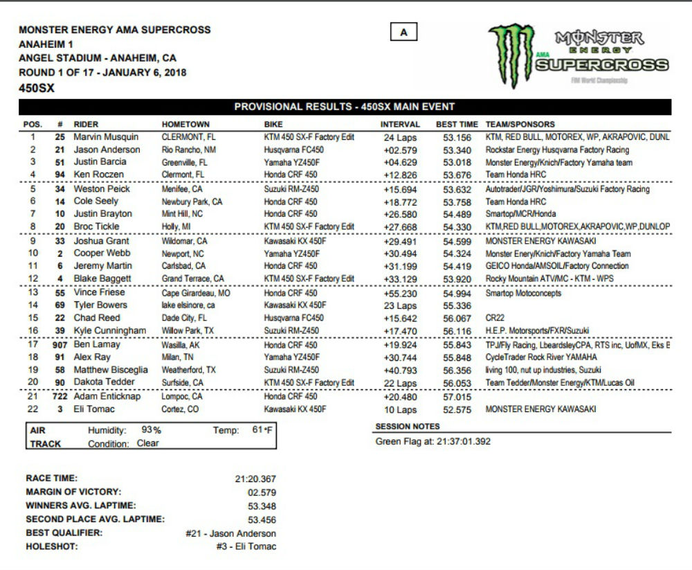 Contudo o arranque da nova época que aconteceu no sábado em Anaheim, na Califórnia, revelou o bom momento de forma do francês Marvin Musquin. O piloto da KTM venceu a corrida final, depois de ter visto Eli Tomac (Kawasaki), que saiu como uma bala, assinando o holeshot, liderar a corrida durante cerca de 10 minutos, até sofrer uma queda que o obrigou a abandonar a prova.