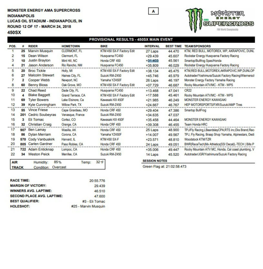 O piloto da KTM alcançou a sua segunda vitória da temporada, numa corrida onde dominou por completo. Musquin largou bem assinou o holeshot e rapidamente disparou na frente da corrida, aproveitando que Jason Anderson (Husqvarna) se envolveu numa embrulhada com  Blake Baggett, Cooper Webb, e Tyler Bowers, que eram obrigados a realizar uma corrida de trás para a frente.