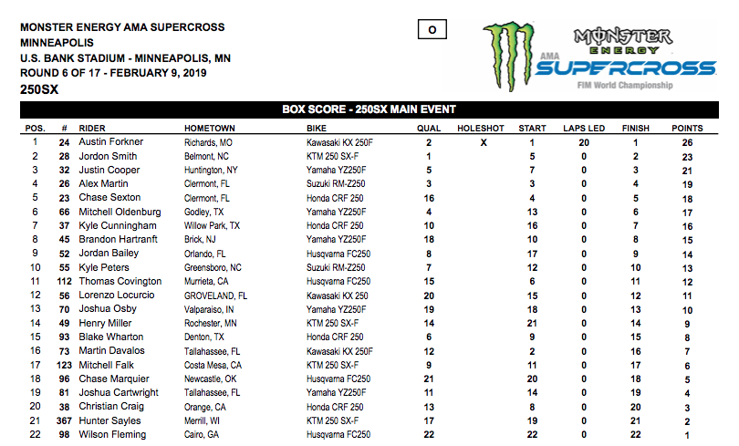 Se na segunda manga de qualificação Austin Forkner dominou, no evento principal da categoria SX250 a história não foi diferente. Forkner conseguiu o holeshot e a partir daí seguiu o seu caminho até à vitória em Minneapolis. Jordan Smith foi quem conquistou a segunda posição, apesar de ter tido problemas com a roda traseira da sua KTM, mesmo na grelha de partida. Excelente corrida do piloto da marca austríaca perante a adversidade inicial. Na terceira posição ficou o piloto de Nova Iorque, Justin Cooper com a Yamaha #32.