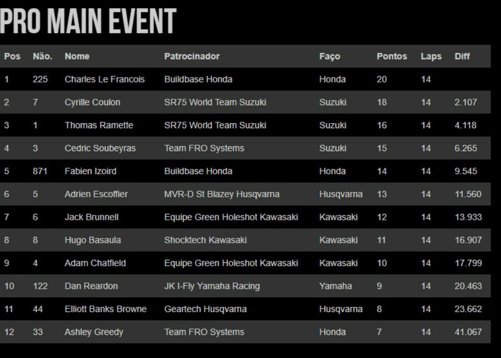 A vitória nesta primeira ronda da temporada do Arenacross UK foi para o francês Charles Le Francois, que relegou Cyrille Coulon para a segunda posição a 2,107s, enquanto Thomas Ramette foi terceiro a 4,118s.