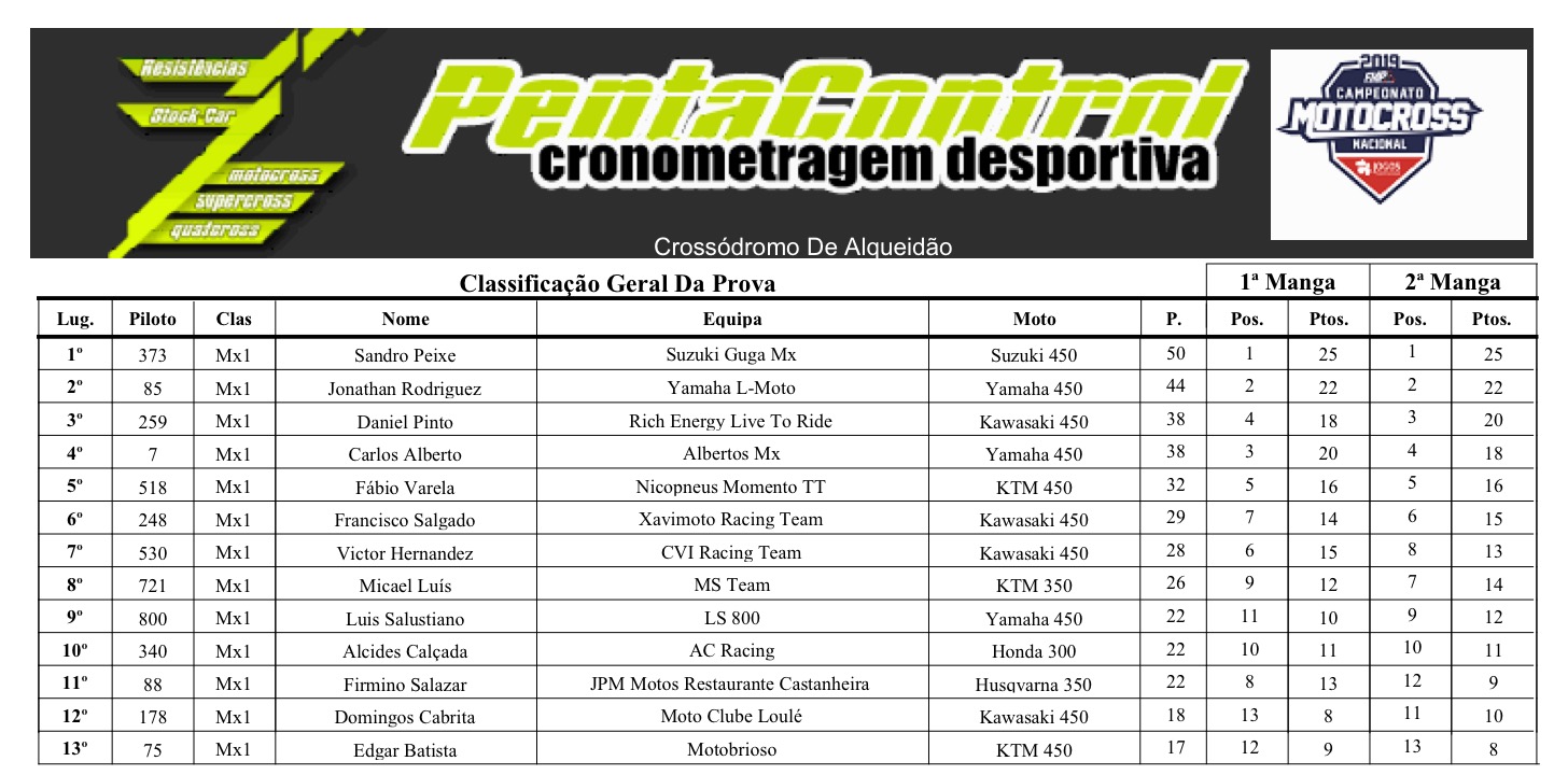 Sandro Peixe (1º/1º) liderou todas as voltas em ambas as corridas e triunfou sempre com uma vantagem próxima de 1 minuto sobre Jonathan Rodriguez (2º/2º). O espanhol alcançou em Alqueidão o melhor resultado de sempre da sua carreira.