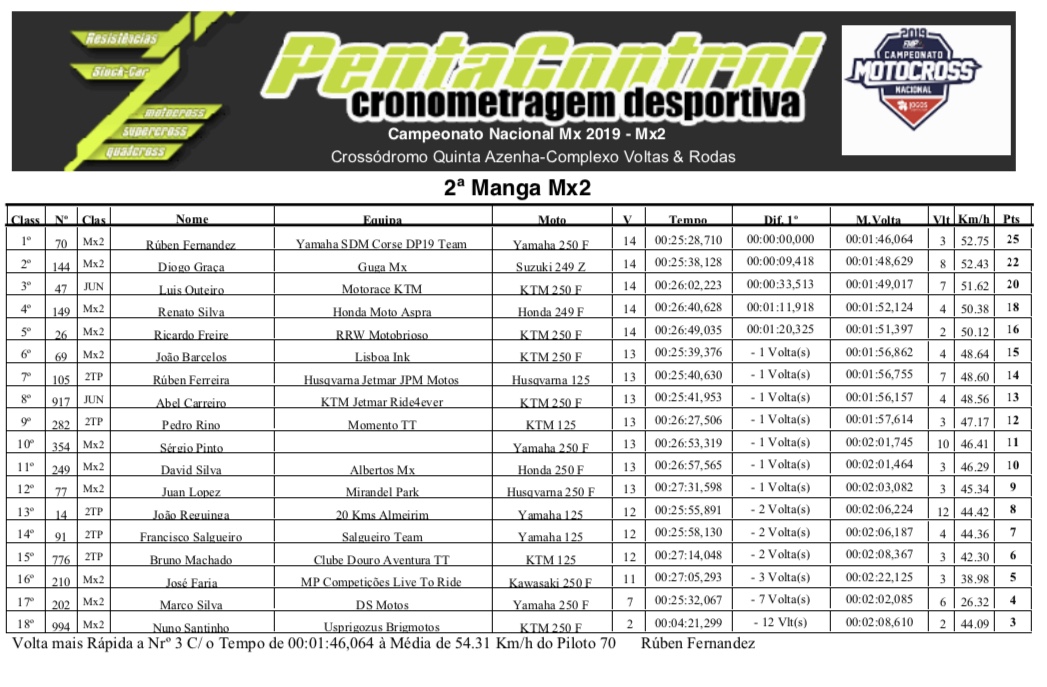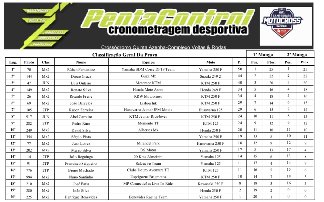 Na classificação geral, Ruben Fernandez (1.º/1.º) venceu naturalmente. Diogo Graça (2.º/2.º) acrescentou quatro pontos à sua vantagem sobre Luís Outeiro (3.º/3.º) na classificação provisória do Nacional de MX2.