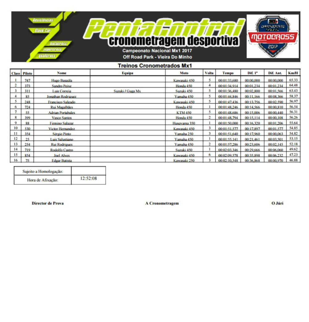 A fechar o top cinco dos cronometrados de MX1, Joaquim Rodrigues (Yamaha) que terminou a 11,166s ma quarta posição, enquanto Francisco Salgado (Kawasaki) foi quinto a 13,756s.