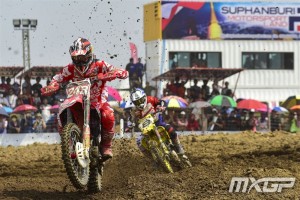 Romain Febvre foi o vencedor do Grande Prémio da Tailândia de MXGP. O atual campeão do Mundo em título dominou por completo esta segunda ronda da temporada, realizada em Suphan Buri, Na segunda manga, o piloto da Yamaha assumiu o comando logo após a largada e beneficiou da embrulhada em que se envolveu Antonio Cairoli (KTM), principal adversário na primeira manga, para dominar por completo a derradeira corrida.