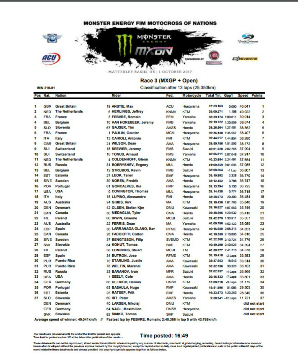 A última corrida, foi verdadeiramente de loucos na luta pela vitória, com o inglês Max Anstie empurrado pelos milhares de adeptos que se deslocaram a Matterley Basin, a assinar o ‘holeshot’ e a dominar as primeiras voltas, com o francês Romain Febvre na segunda posição e o holandês Jeffrey Herlings na terceira posição.