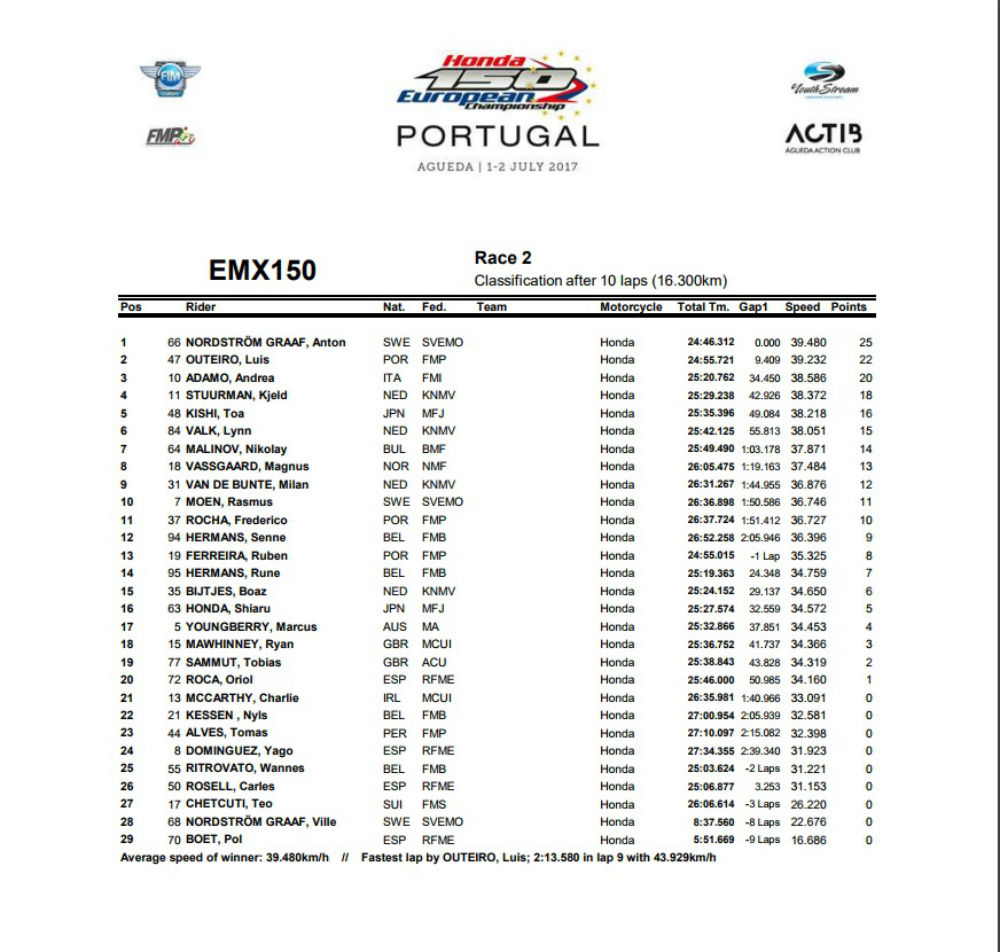Com este segundo lugar, Luís Outeiro termina esta ronda do Europeu Honda 150cc na terceira posição com 42 pontos.