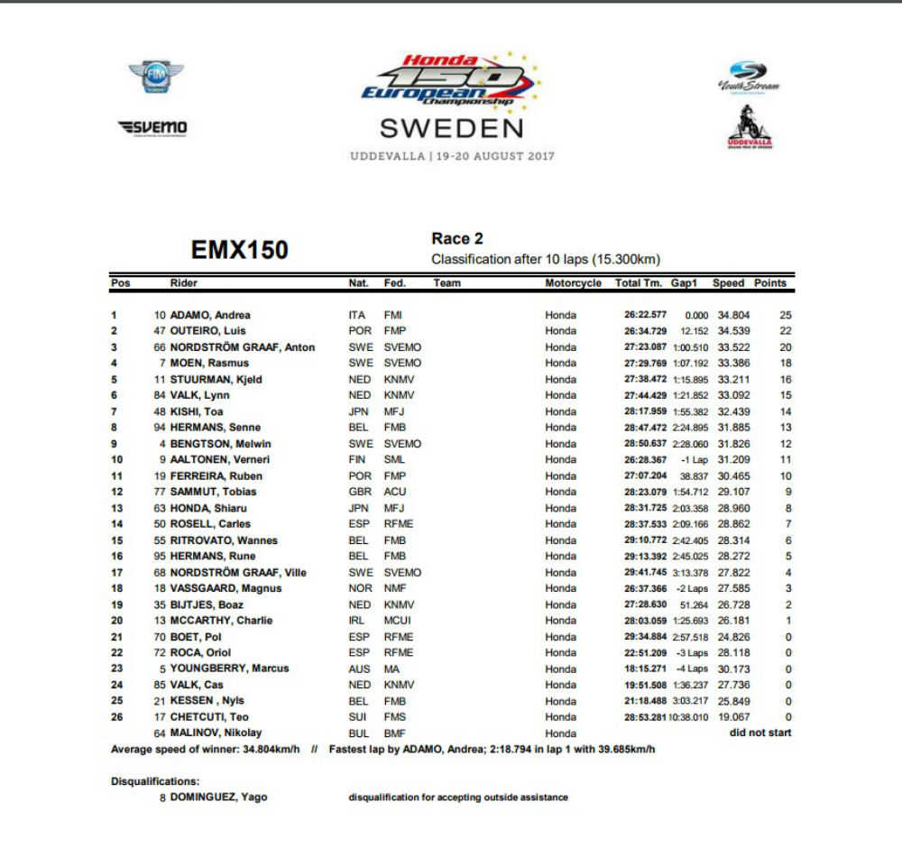 Desta forma, Luís Outeiro termina o GP da Suécia com um 7º lugar com 26 pontos o que o faz descer à terceira posição do campeonato onde soma agora 156 pontos menos 20 que o líder Andrea Adamo e 16 pontos de diferença para o segundo classificado que é agora o sueco Anton Nordström Graaf.