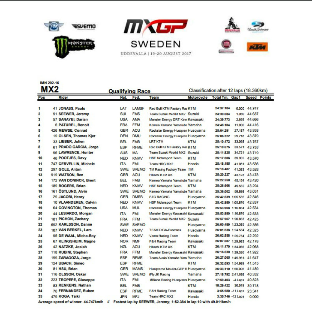 Já Benoit Paturel (Yamaha) terminou a corrida de qualificação na quarta posição a 11,000s do vencedor numa corrida, Conrad Mewse ( Husqvarna) só por duas vezes mostrou ter capacidade para andar na frente do piloto da Yamaha que foi quase sempre mais forte. Mewse terminou no quinto lugar a 27,187s do vencedor.