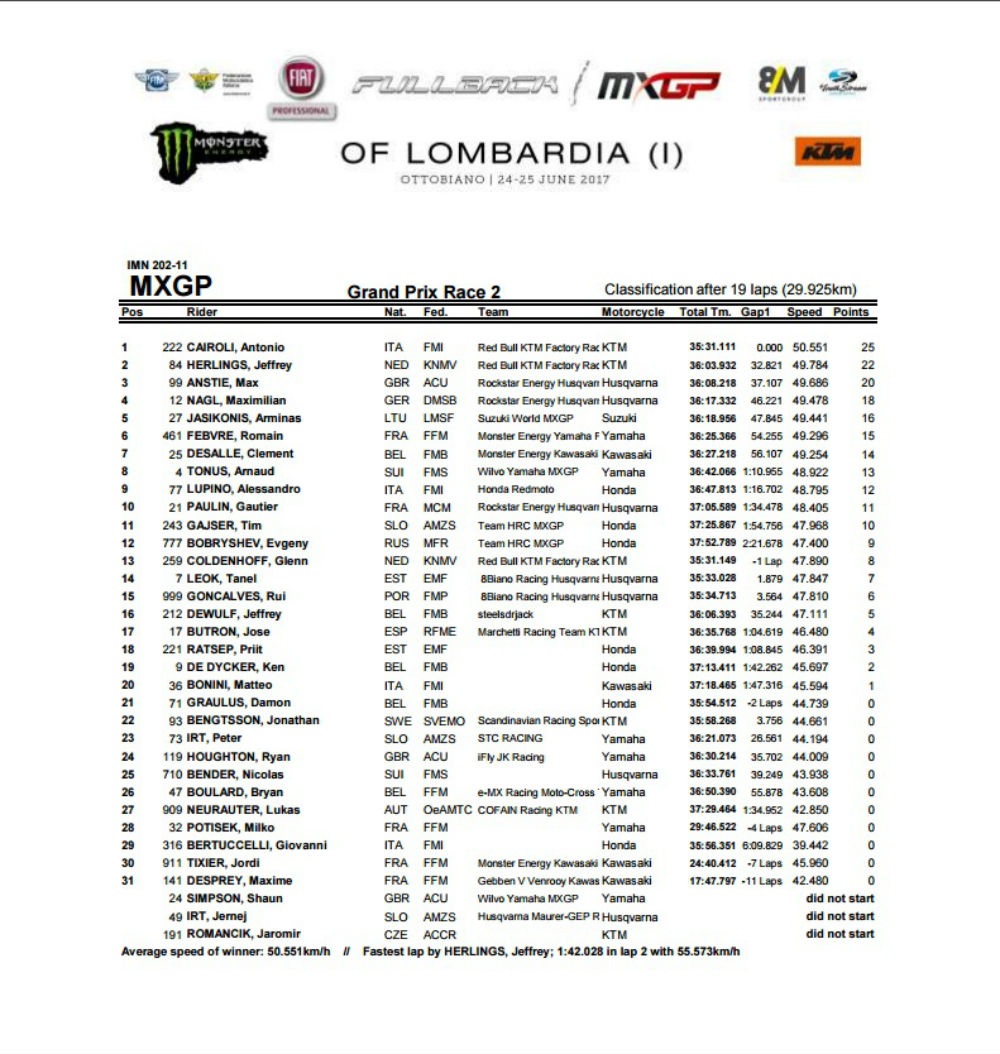 Com estes resultados, o veterano piloto da KTM conquistou a vitória nesta ronda do campeonato com 50 pontos, enquanto Herlings foi segundo 44 ponto e Anstie ocupou o lugar mais baixo do pódio com 36 pontos.