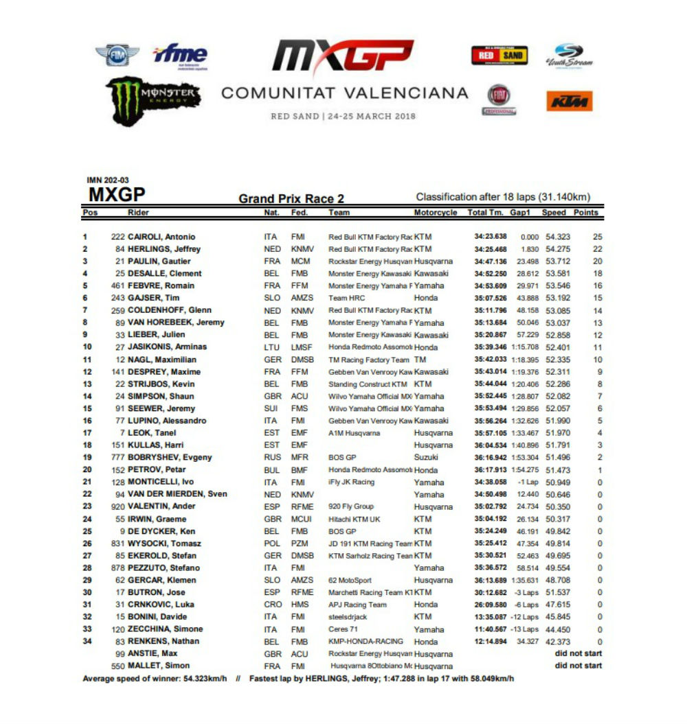 Com estes resultados, Cairoli conquista a vitória desta terceira ronda do Mundial de MXGP, com Herlings na segunda posição e Clement Desalle na terceira posição.