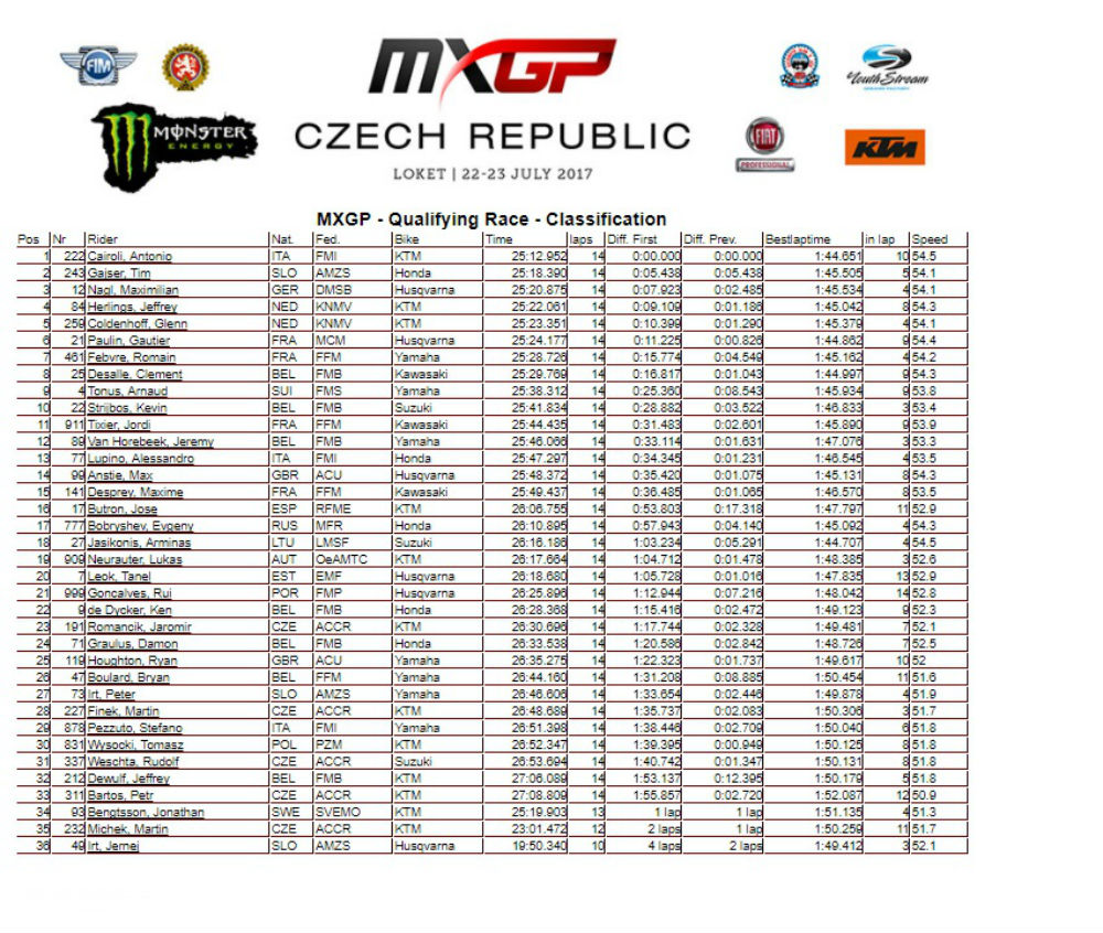 Já Tim Gajser, que parece estar a regressar à boa forma, terminou na segunda posição a 5,438s do vencedor, enquanto Max Nagal (Husqvarna) que no inicio da corrida travou uma intensa luta com Cairoli pelo segundo lugar, acabou na terceira posição a 7,923s do primeiro