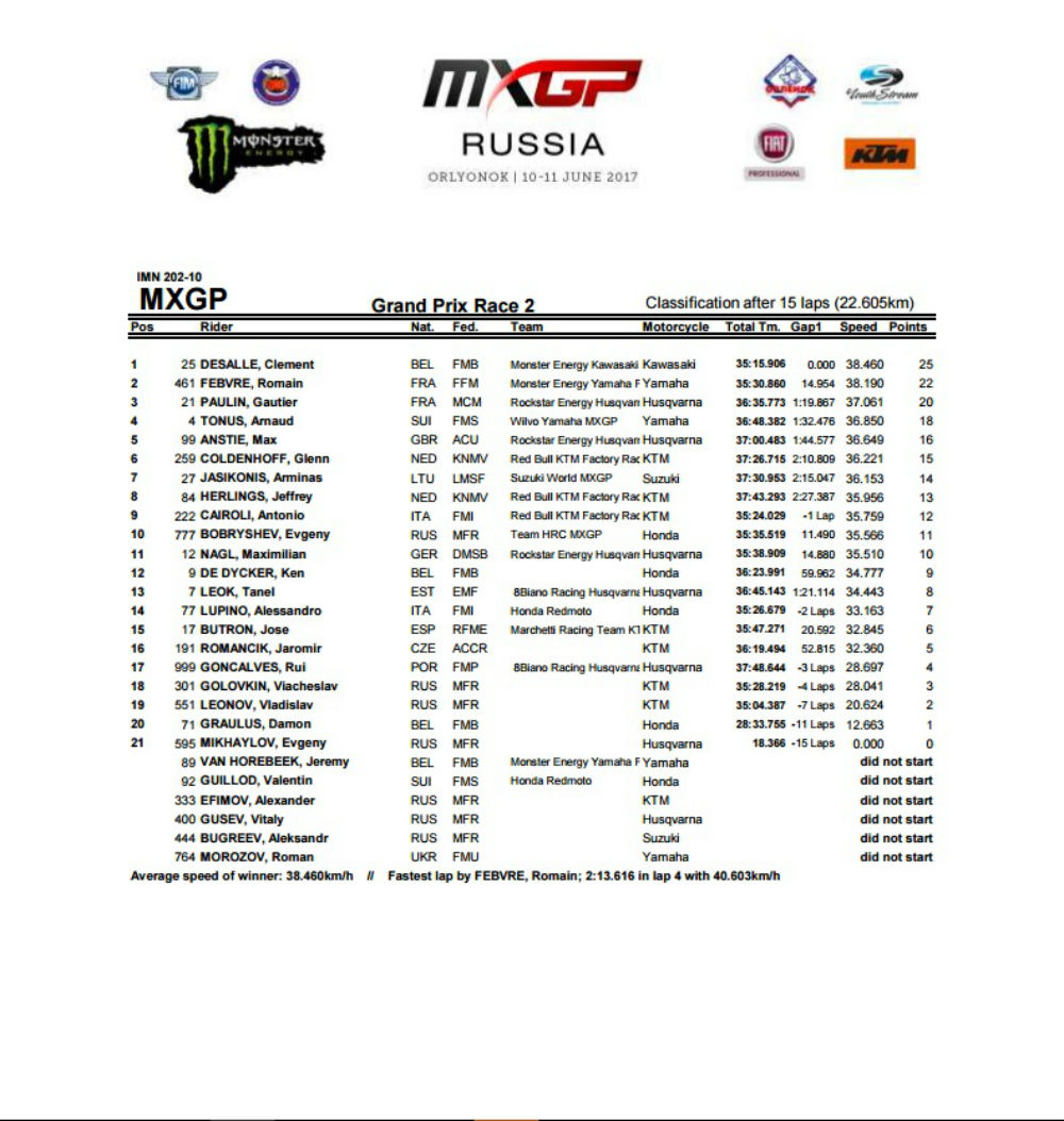 Nas contas finais, Dessale é o vencedor do GP da Rússia, seguido de Jeffrey Herlings (KTM) que depois da vitória na primeira manga, terminou a derradeira corrida na sexta posição, enquanto, Gautier Paulien subiu ao lugar mais baixo do pódio.