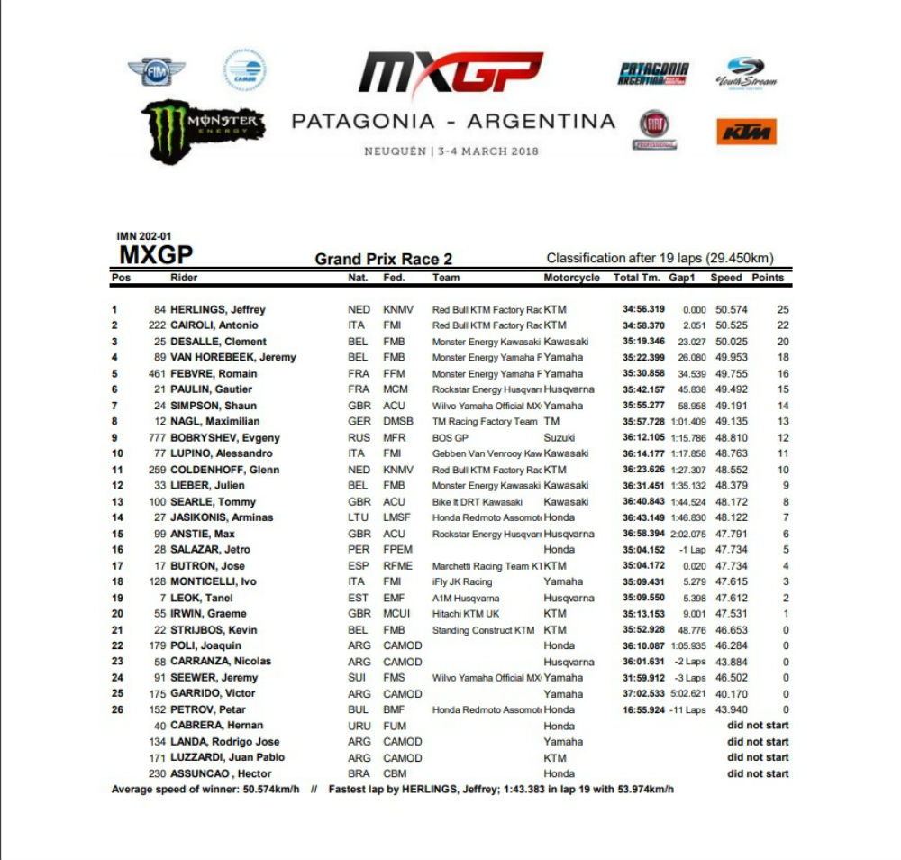O italiano Campeão do Mundo em título, não resistiu ao melhor andamento de Herlings e cedeu assim nas voltas finais permitindo que o piloto holandês, depois de ter sido segundo na primeira corrida do dia, conquistasse assim a vitória na segunda manga e no GP da Argentina.