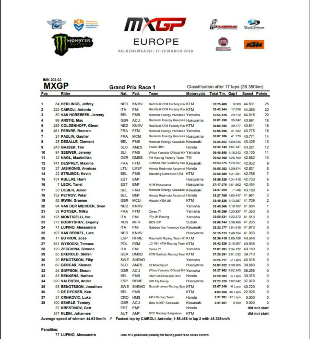 Até ao final desta primeira manga, o Campeão do Mundo em título, tudo fez para chegar de novo à liderança, mas Herlings esteve demolidor nas areias de Valkenswaard, conquistando a vitória e relegando Cairoli para a segunda posição a 17,536s, enquanto Jeremy Van Horebeek terminou na terceira posição a 29,712s.