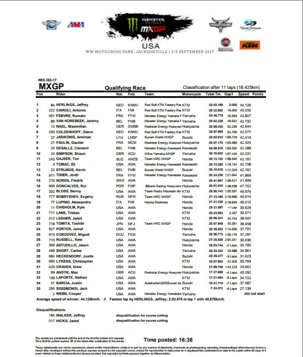 Contudo Herlings acabou por se despachar do líder do Mundial e vencer a corrida de qualificação relegando para a segunda posição Antonio Cairoli a 19,666s, enquanto a terceira posição foi ocupada por Roman Febvre (Yamaha) a 45,593s.
