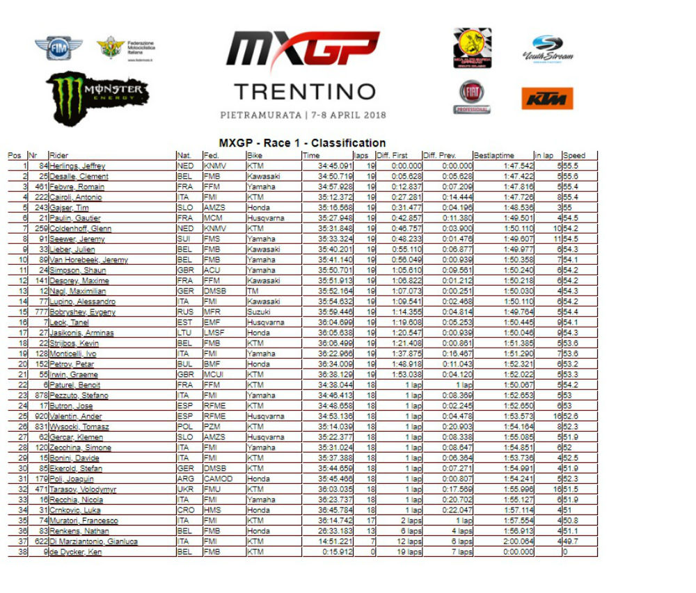 Na luta pelo segundo lugar Clement Desale (Kawasaki) levou a melhor sobre a concorrência ao terminar a 5,628s de Herlings, na frente Romain Febvre (Yamaha) que foi terceiro a 12,837s.