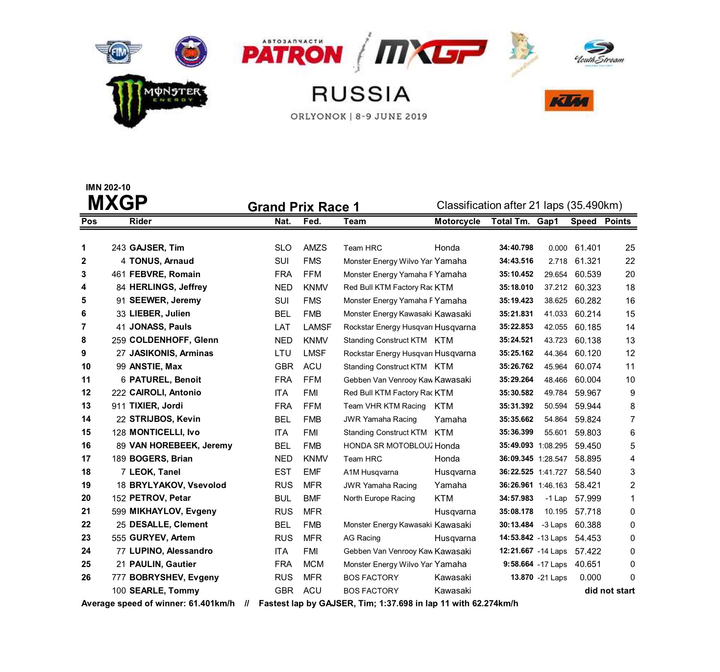 Vencedor neste circuito em 2018, Clement Desalle ainda tentou perseguir Tim Gajser nos momentos iniciais mas acabaria por cometer um erro à quarta volta que o fez perder vários lugares. Arnaud Tonus aproveitou para subir à 2ª posição e, mais uma vez, deu provas do seu talento ao cortar a meta a pouco mais de 2 segundos do vencedor.