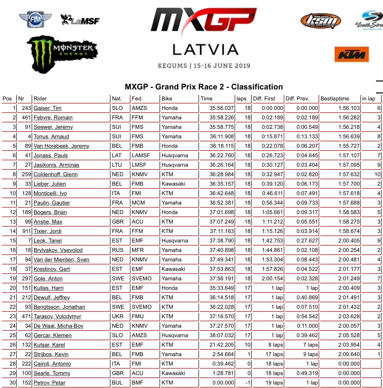 Jeremy Seewer liderou o pelotão durante 11 das 18 voltas da segunda corrida. No entanto, o suíço não conseguiu impedir a ultrapassagem de Gajser e, na última volta, seria ainda ultrapassado por Romain Febvre.