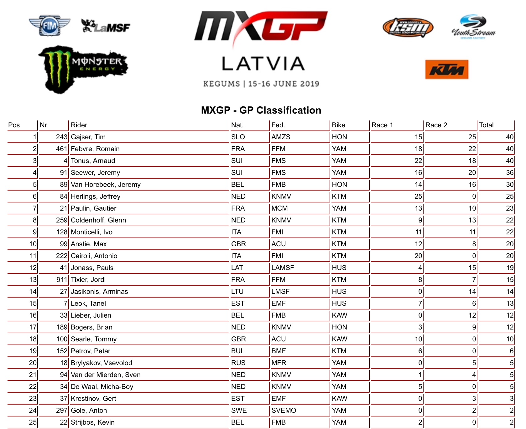 Na classificação geral, Tim Gajser (6º/1º), Romain Febvre (4º/2º) e Arnaud Tonus (2º/4º) terminaram todos com 40 pontos. As regras de desempate decidiram a vitória a favor do piloto da Honda.