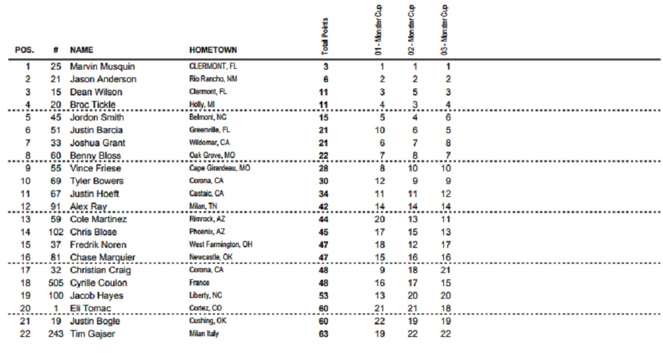 Pelo sétimo ano consecutivo tivemos um vencedor diferente no entanto o piloto que subiu ao lugar mais alto do pódio desta edição, Marvin Musquin, entrou para a história do evento. Isto porque o homem da KTM tornou-se no segundo piloto a vencer as três mangas da competição – o primeiro foi Ryan Villopoto em 2011 – e com isso arrecadou o prémio de um milhão de dólares destinado a quem consegue tal objetivo. O domínio de Musquin foi tão grande que das três corridas realizadas duas delas dominou na sua totalidade. Apenas o vencedor do ano passado, Eli Tomac, conseguiu incomodar Marvin Musquin na primeira corrida até ser travado por uma queda.
