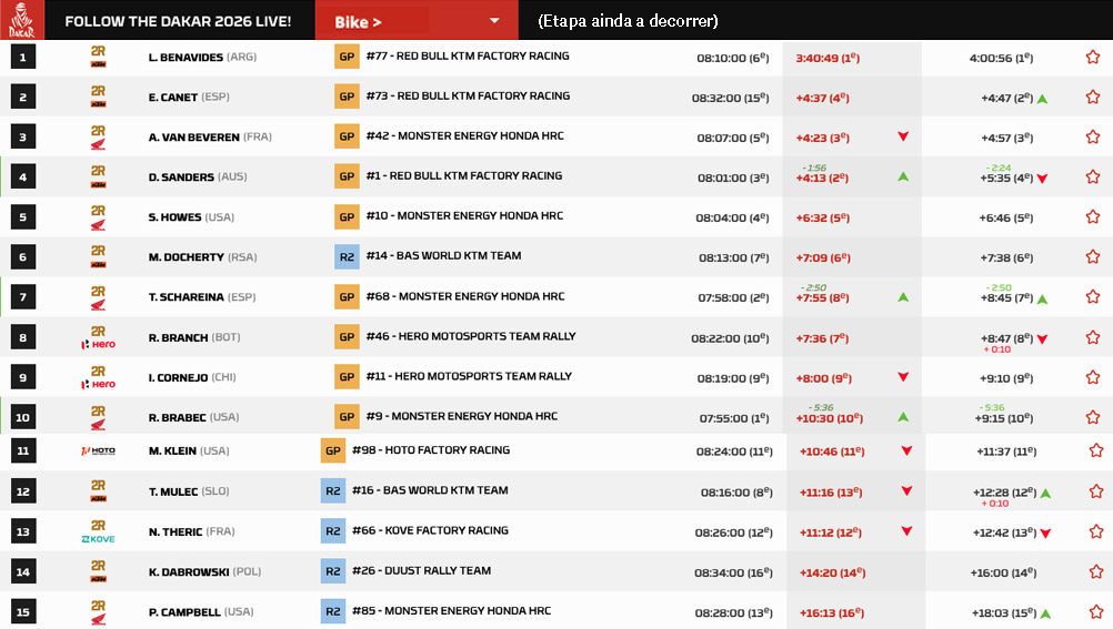 Os três primeiros classificados da classificação geral permanecem os mesmos, com Daniel Sanders no topo, mas o seu terceiro lugar hoje colocá-lo-á em desvantagem amanhã em comparação com o seu perseguidor mais próximo, Ricky Brabec (+4’25”), que partirá da próxima etapa na décima posição, a 21 minutos do australiano.