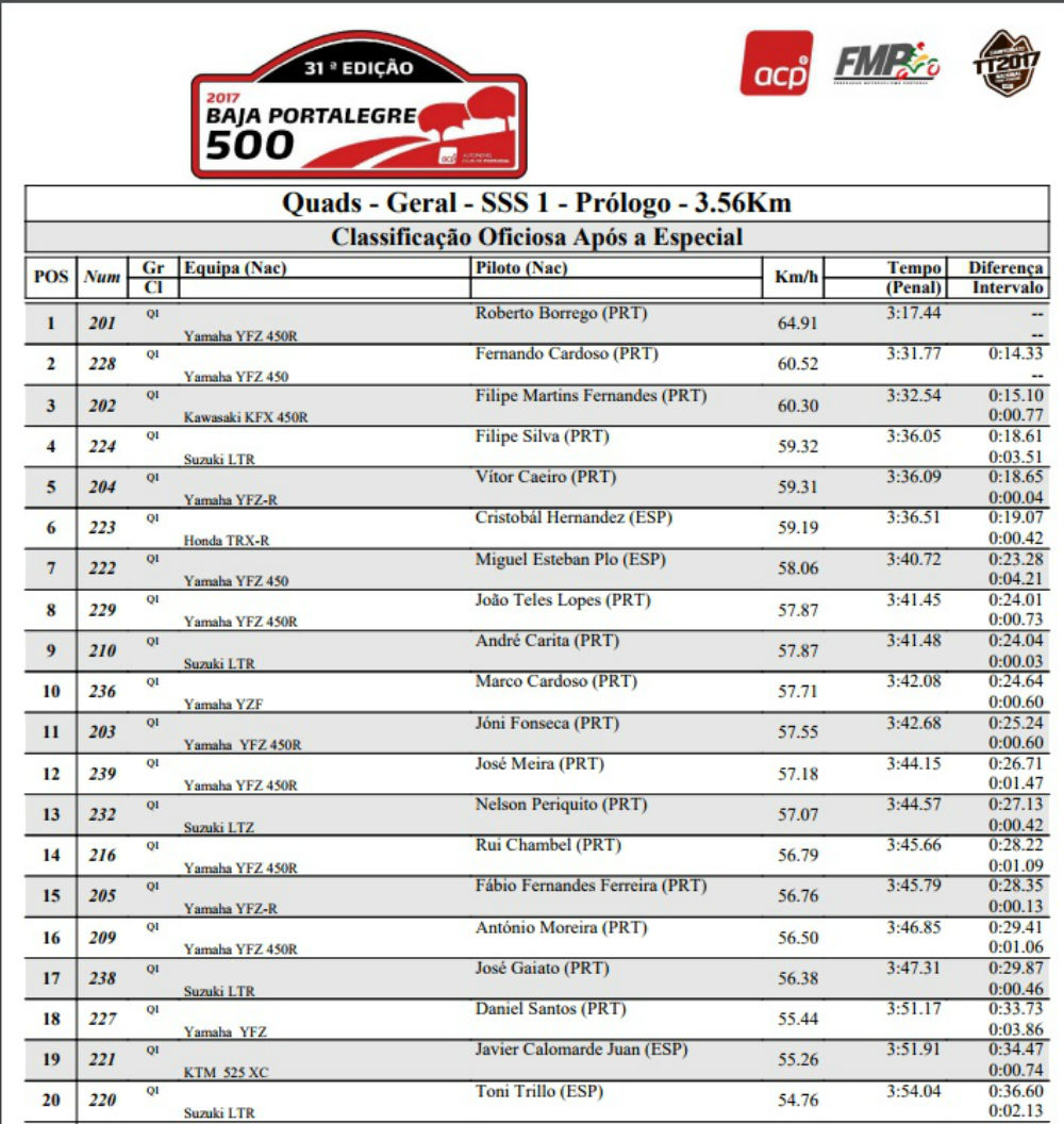 Aos comandos do seu Yamaha YFZ 450R, Borrego entrou na prova alentejana ao ataque e superiorizou-se à concorrência relegando Fernando Cardoso (Yamaha) para a segunda posição a 14,33s, enquanto Filipe Fernandes (Kawasaki) foi o terceiro mais rápido a 15,10s de Borrego.