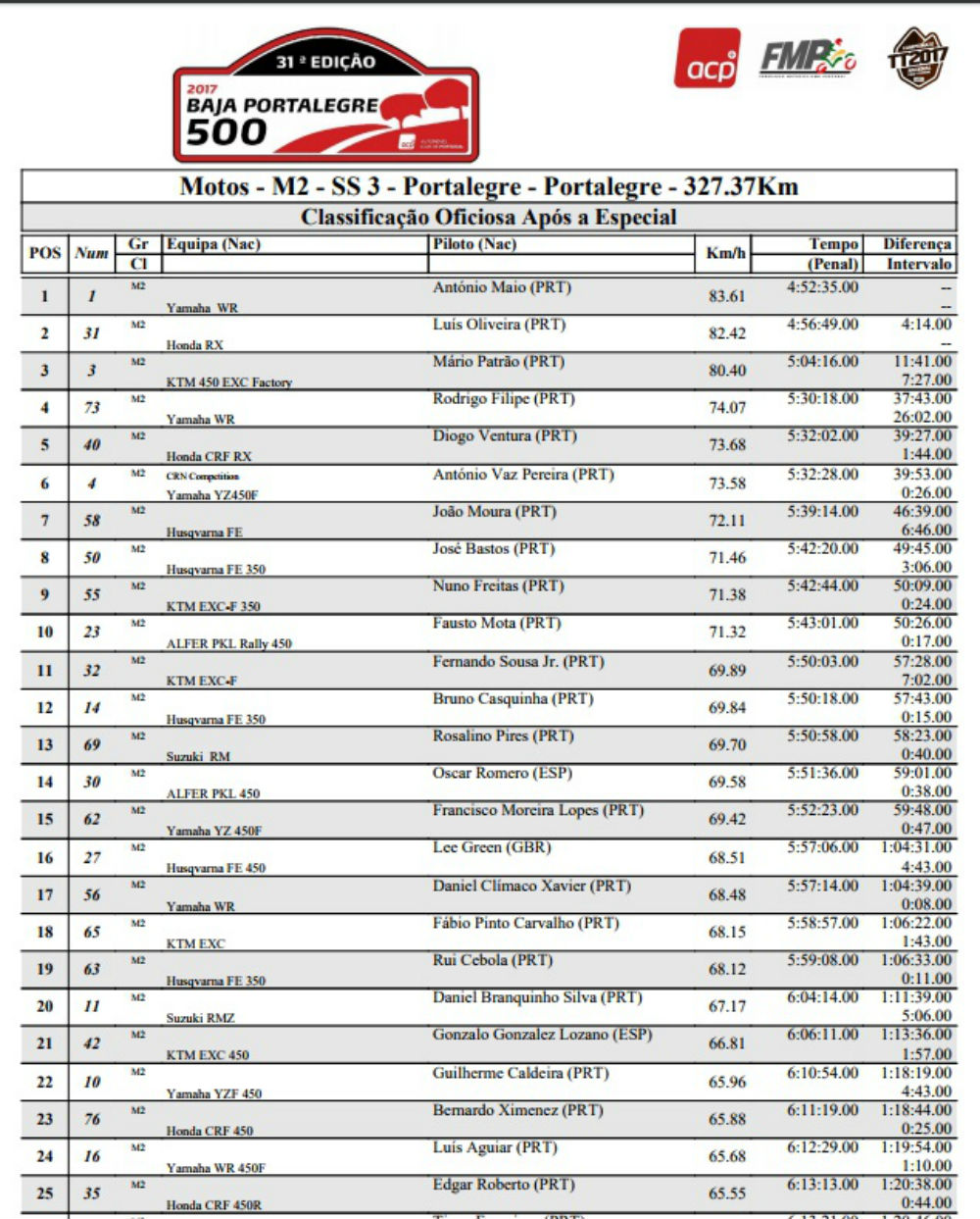 O terceiro lugar acabou nas mãos de Mário Patrão, com o piloto da KTM a terminar a 11m41s do vencedor. “Tive alguma dificuldade em entrar no ritmo, mas acho que fiz um bom trabalho que era rolar sem cometer erros e sem arriscar em demasia. Venho de uma prova diferente da Baja de Portalegre e não tive tempo para preparar a prova, mas fiz o melhor possível e a minha equipa está de parabéns porque a moto esteve impecável”.