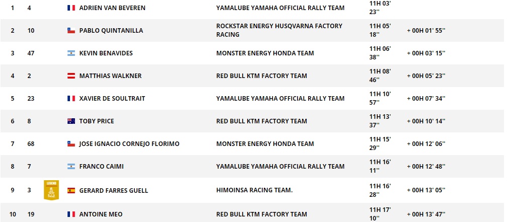 O vencedor do Dakar de 2016, Toby Price, é sexto a 10m14s de Adrien Van Beveren, enquanto José Ignacio Cornejo, substituto do lesionado Paulo Gonçalves, aparece num positivo sétimo lugar. O melhor estreante em 2017, Franco Caimi, é oitavo e permite à Yamaha ter três pilotos precisamente no top oito. Gerard Farrés Guell e Antoine Méo fecham o lote dos 10 primeiros, onde todos cabem em menos de 15 minutos. Às portas deste restrito grupo está Stefan Svitko.