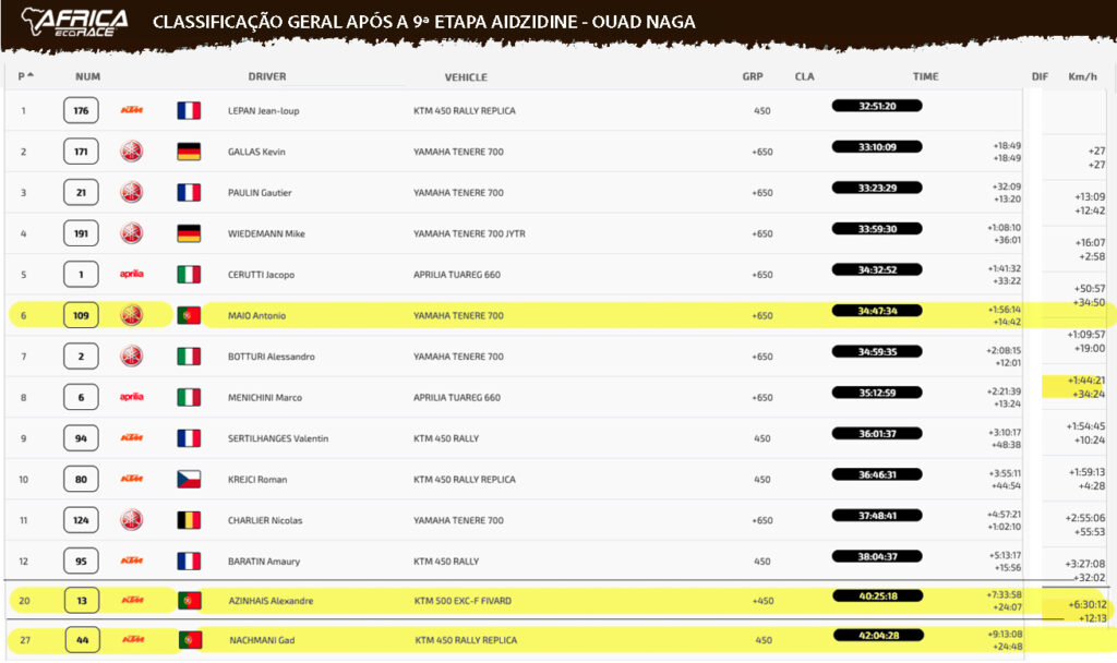 “Amanhã é uma etapa muito importante porque vai ser a última etapa que vamos disputar na Mauritânia. A terceira posição é muito boa para partir porque assim não vou ter de ir a abrir pista. De resto está tudo a correr bem e estou motivado para continuar com o bom trabalho que tem sido feito até agora”, explicou ainda António Maio no final da nona etapa, claramente satisfeito com o resultado alcançado e confiante para os desafios que ainda se avizinham.