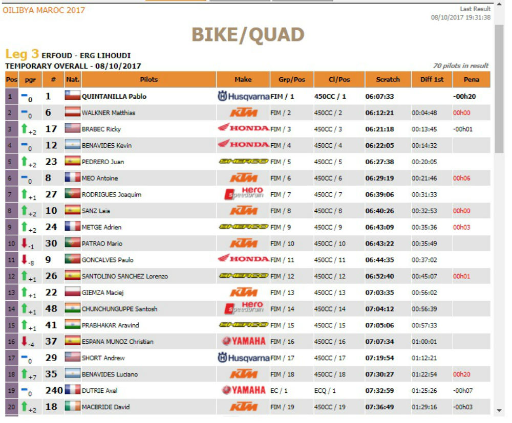 Com estes resultados, Pablo Quintanilla assumiu o comando do rali de Marrocos, relegando para a segunda posição , Matthias Walkner (KTM) a 4m48s, enquanto Rick Brabec é terceiro a 13m47s.