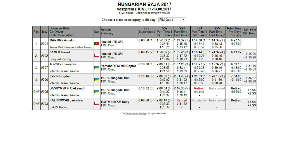 O piloto português, actual campeão nacional de Quads, aos comandos do seu Suzuki LTR 450, depois de já ter vencido o prologo de sexta e a etapa de sábado, repetiu o feito este domingo ao ser o mais forte nos dois sectores selectivos de, ambos na distancia de 136,6 quilómetros, que compunham a última etapa da Baja da Hungria