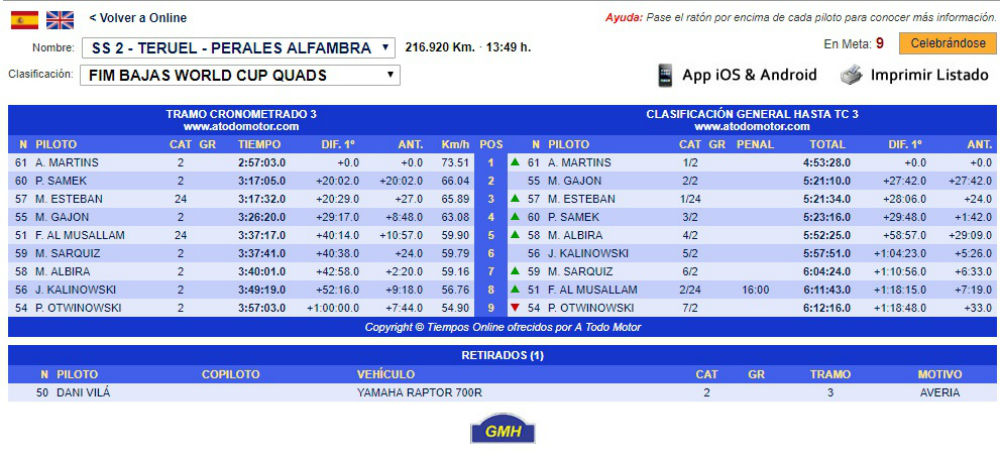 Na categoria de Quads, o português Arnaldo Martins esteve em destaque ao terminar as duas tiradas de hoje, a primeira de 134 quilómetros, entre as localidades de Celadas e Teruel e a segunda de 217 quilómetros que terá lugar durante da parte da tarde entre Teruel e Perales Alfambra, na frente da classificação com uma vantagem de 27m42,0s para Mario Gajon que liderava a classificação à partida para o dia de hoje.