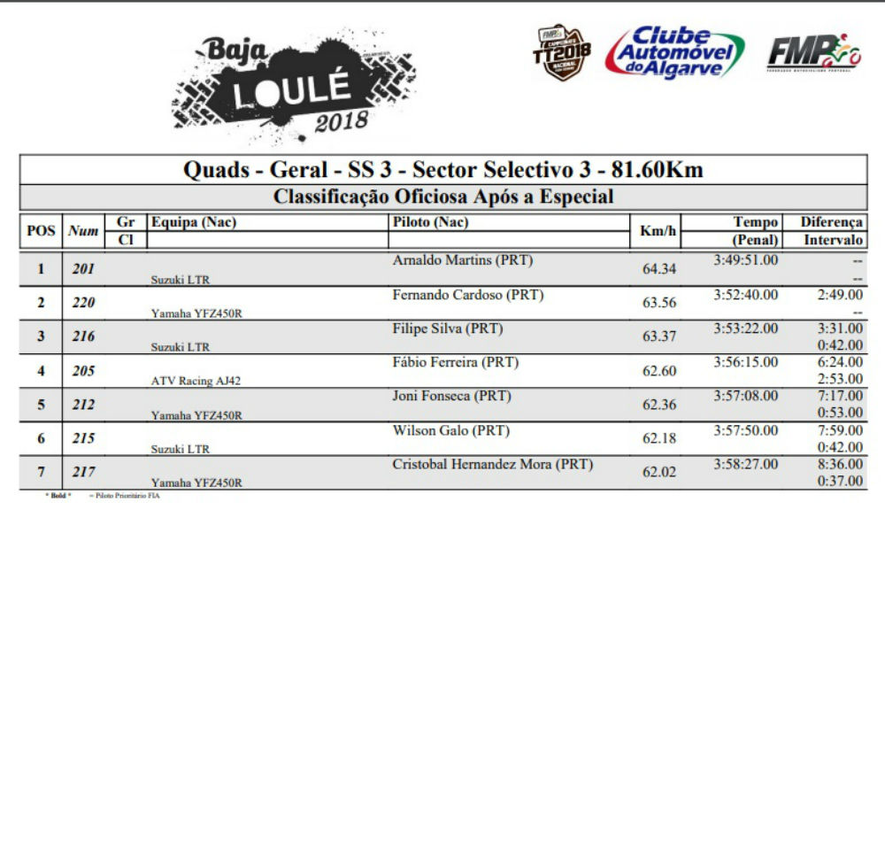 O piloto da Suzuki foi o mais rápido no terceiro e derradeiro sector selectivo ao realizar o tempo de 1h13m02s e relegando para a segunda posição Fernando Cardoso (Yamaha) a 54,00s, enquanto Filipe Silva (Suzuki) foi terceiro a 1m25s do vencedor da última tirada da Baja algarvia.