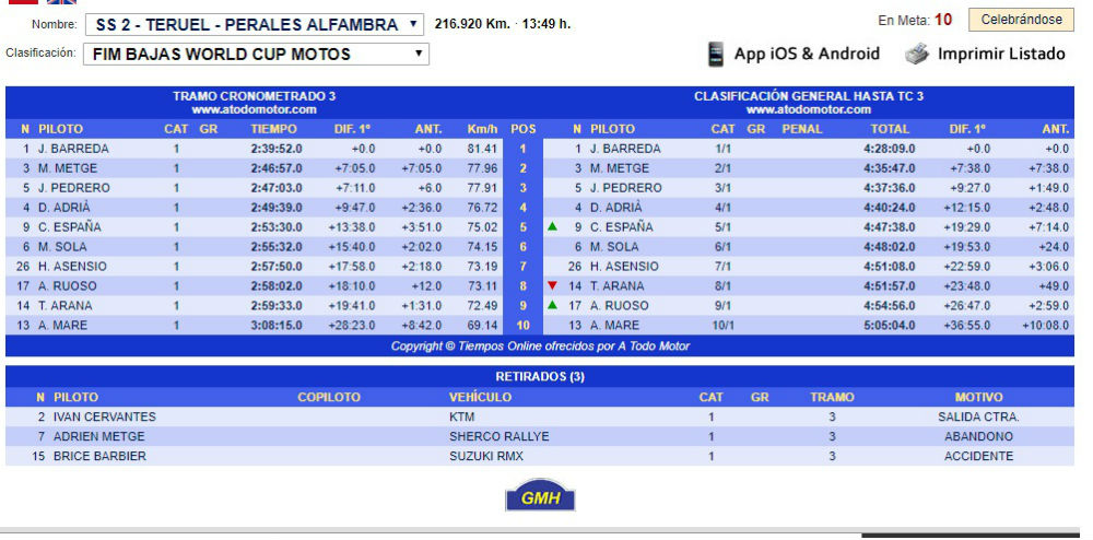 Nota ainda para o abandono de Ivan Cervantes da KTM que à entrada para este segundo dia de prova era segundo classificado mas que abandonou devido a uma saída de estrada na primeira especial deste sábado.