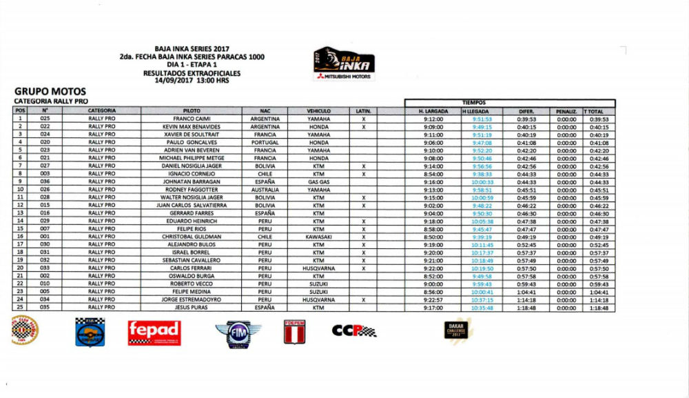 O vencedor desta primeira etapa da Baja Inka foi o argentino Franco Caimi (Yamaha) que realizou o tempo de 39m53s, enquanto Kevin Benavides (Honda) foi segundo a por 22 segundos do vencedor.